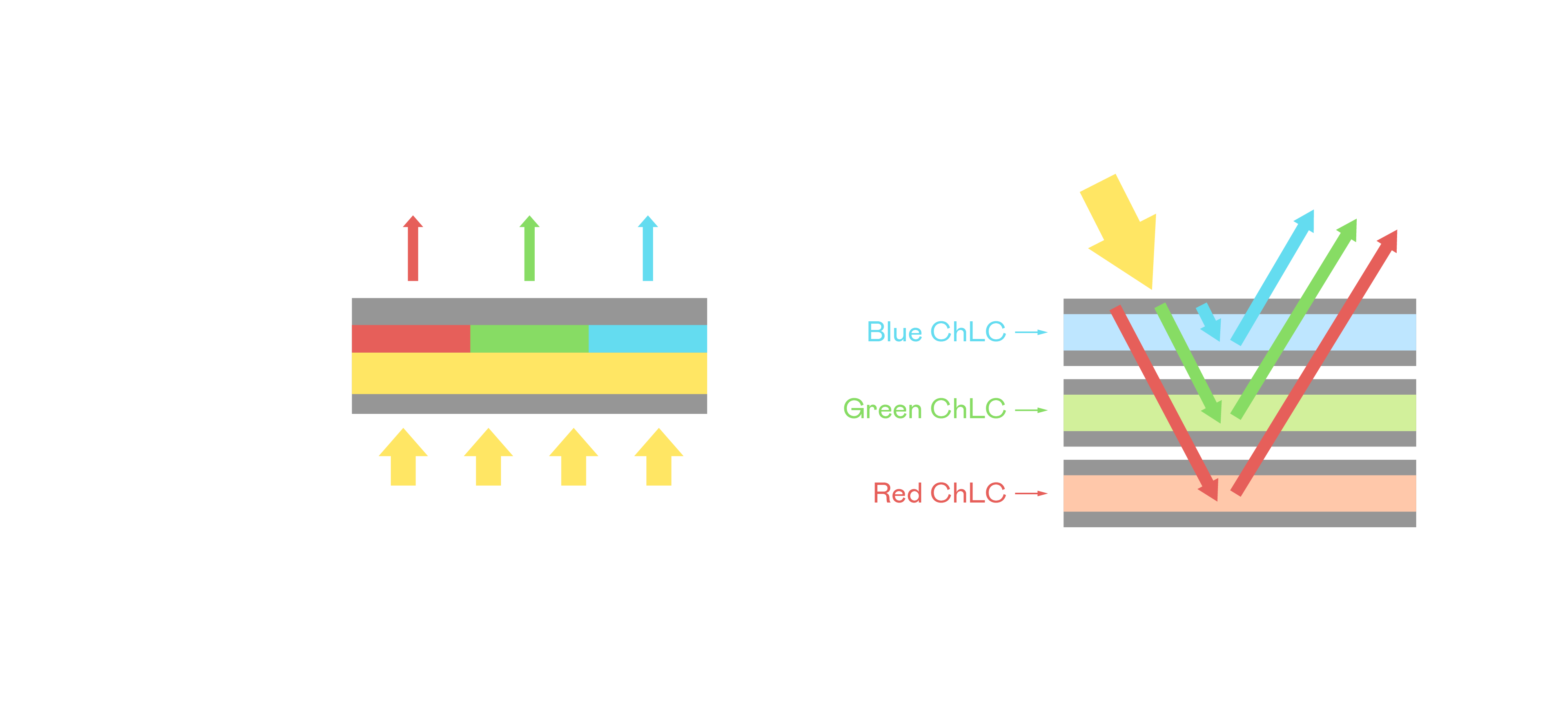 J9集团胆固醇液晶显示器是由红、绿、蓝三层胆固醇液晶面板堆叠而成,并采用无彩色滤光片设计,减少环境光在反射过程中的损耗。